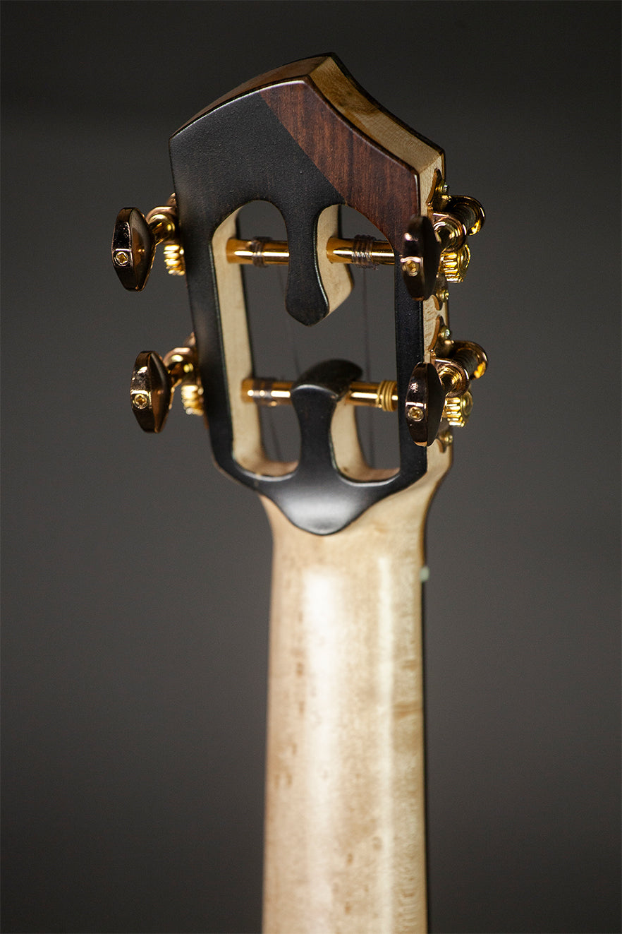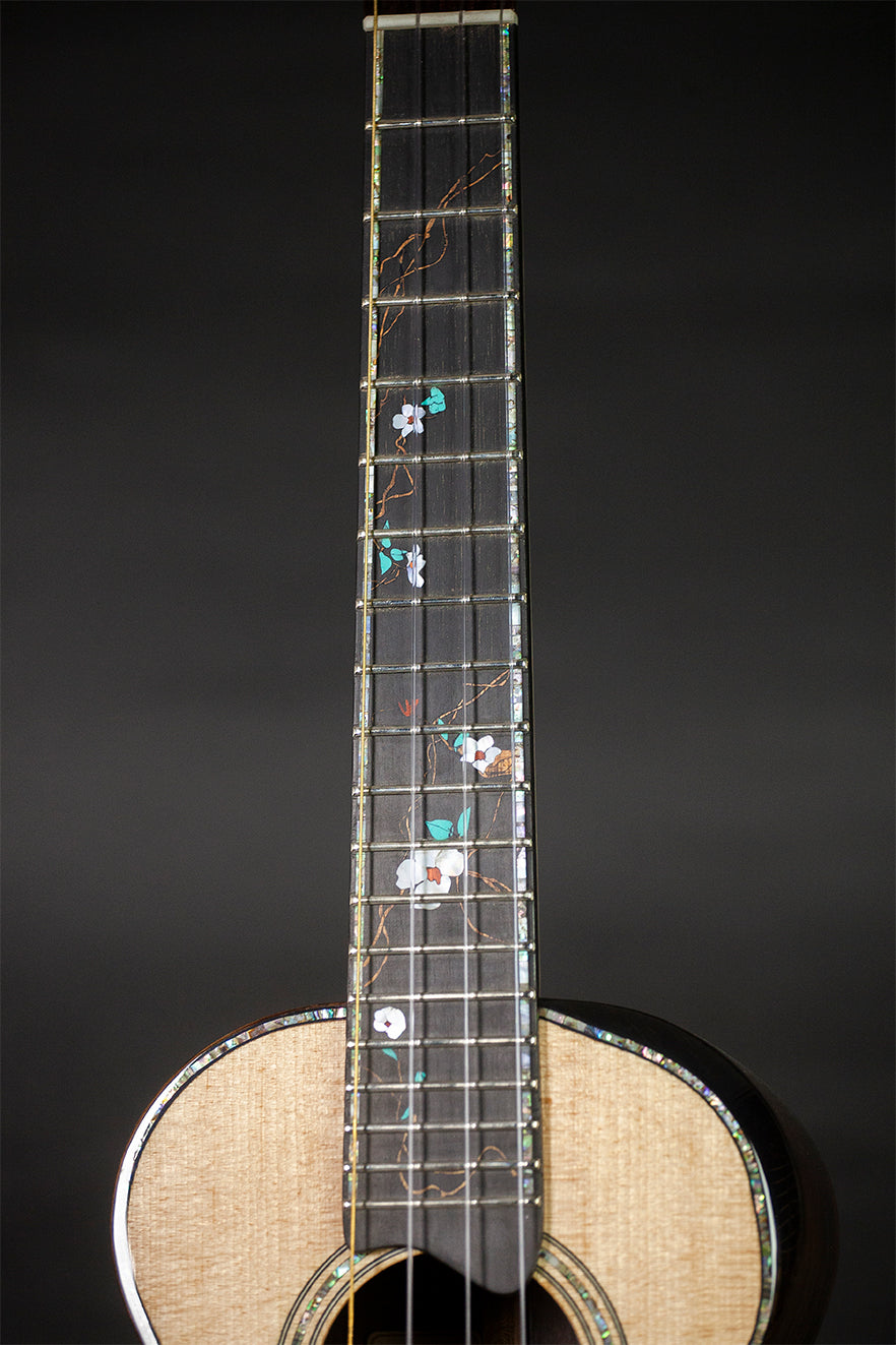 - Fingerboard Design - Thematic Vine inlay design using Mother-of-Pearl, Koa, Paduck & reconstituted stone