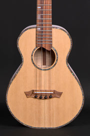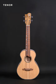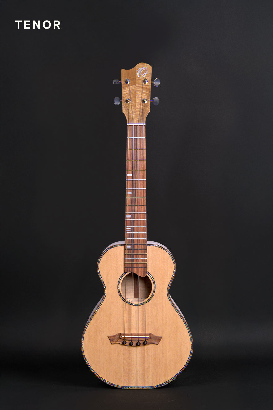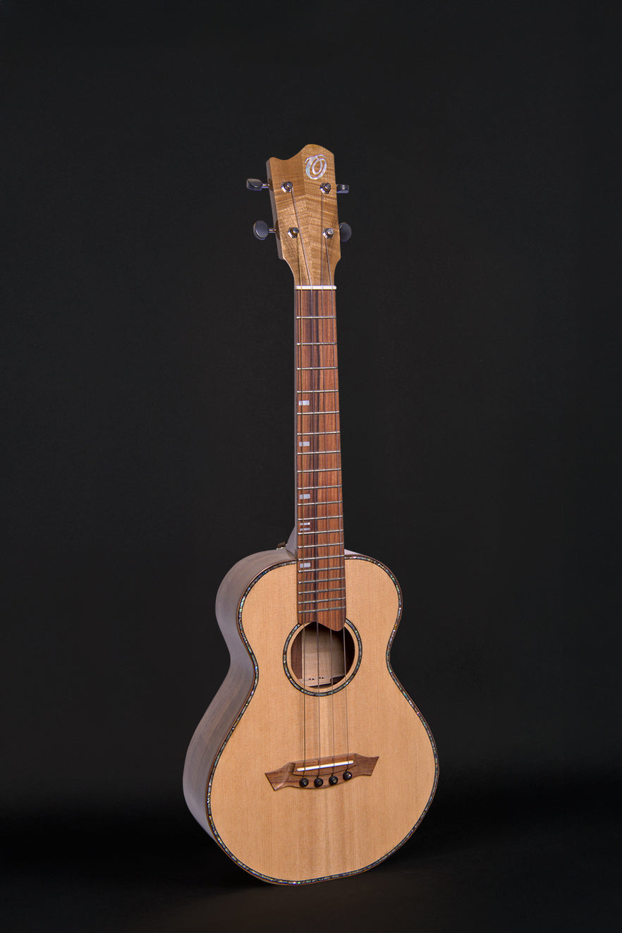 Made in all-solid Port Orford Cedar and Figured Myrtle, this Ohana tenor boasts some seriously fine wood sets.  A natural, lighter tone stripe in the Port Orford Cedar complements the wood binding and copious abalone inlay. The myrtle is stunning in color play and figuring, a truly fine example of this unique tonewood.