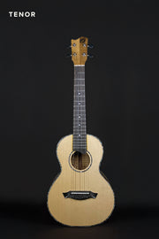 This early prototype slim-body tenor was made of solid Port Orford Cedar top and Figured Myrtle back and sides. ,