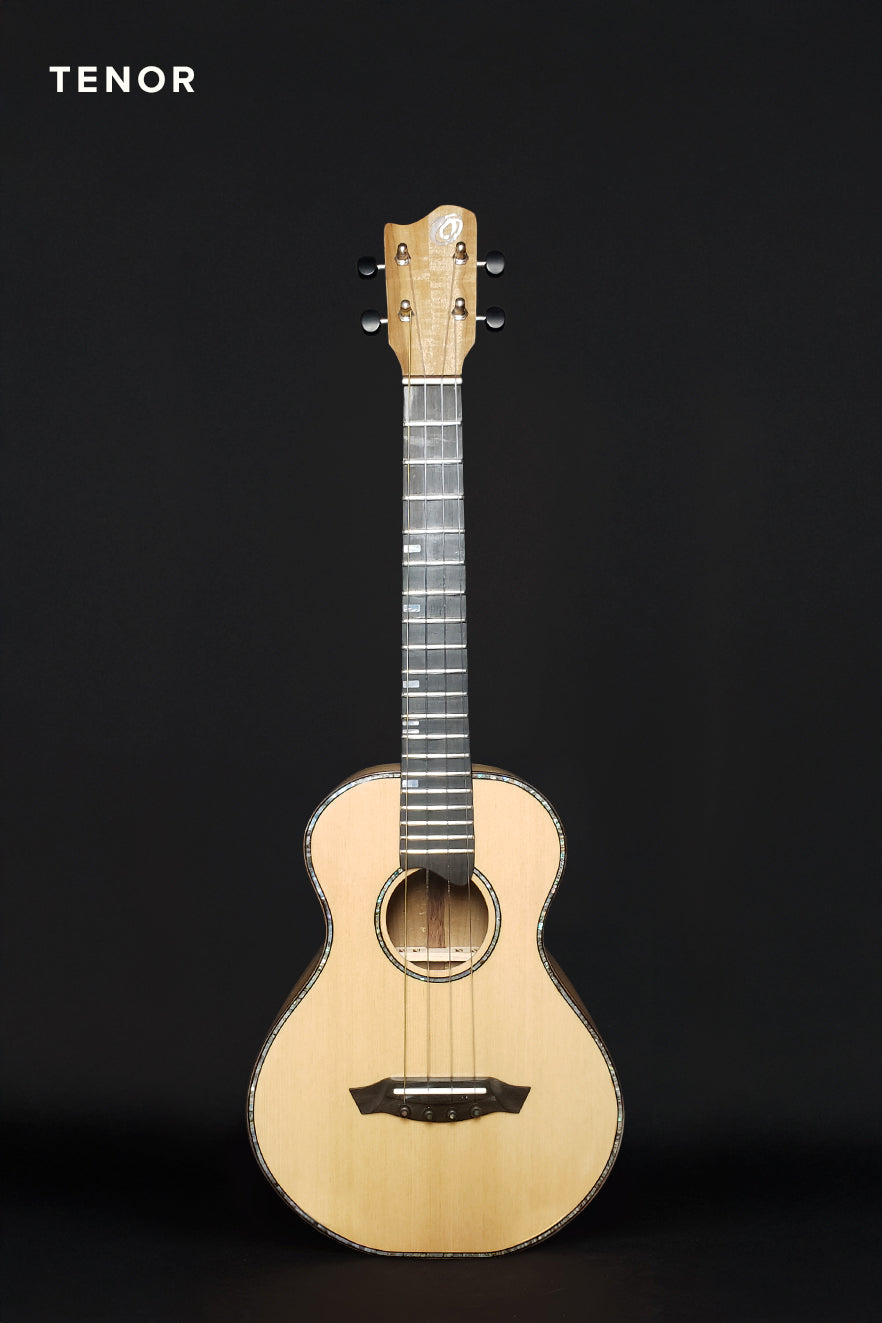 Made in all-solid Port Orford Cedar and Figured Myrtle, this Ohana tenor boasts some seriously fine wood sets. A natural, lighter tone stripe in the Port Orford Cedar complements the rosewood binding and copious abalone inlay. The myrtle is stunning in color and figure, a truly fine example of this unique tonewood. Myrtlewood offers a blend of warmth and clarity that compliments the Port Orford Cedar.
