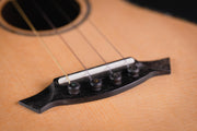 A pin bridge keeps minimal tension on the sound board of the instrument, with each pin adorned in blue abalone to compliment the purfling of the body and the figuring of this select koa set.
