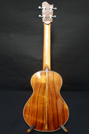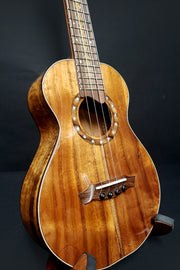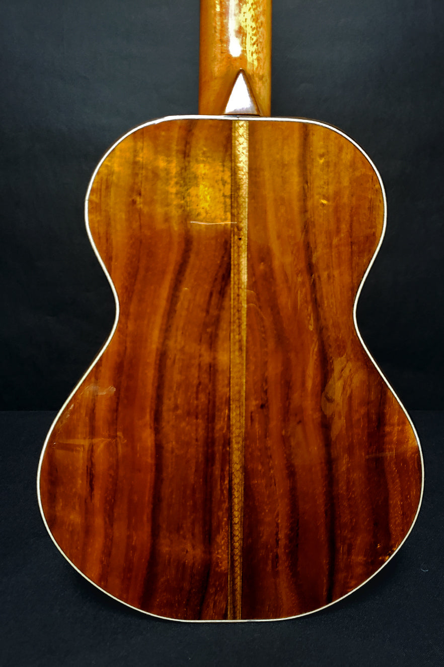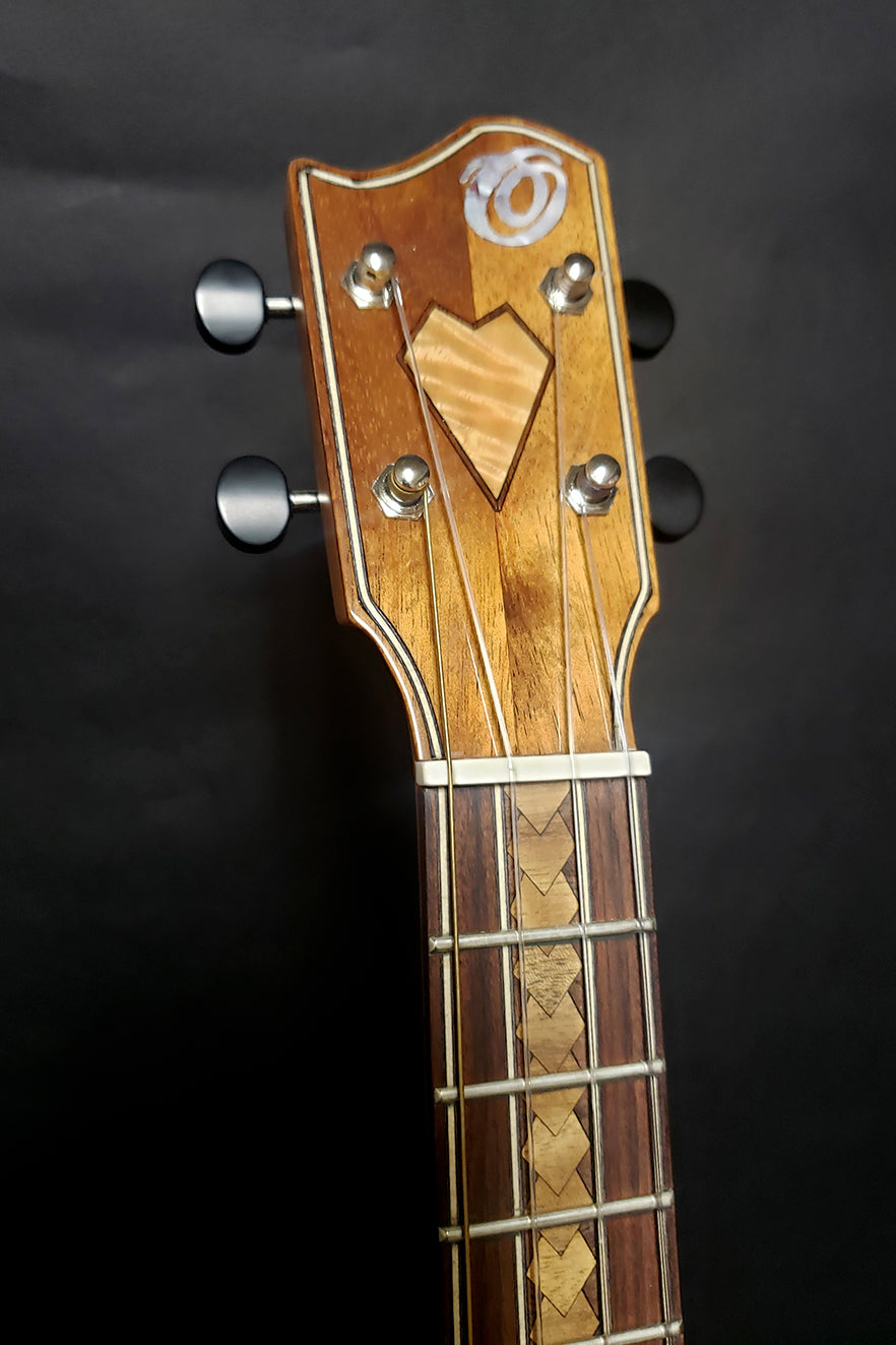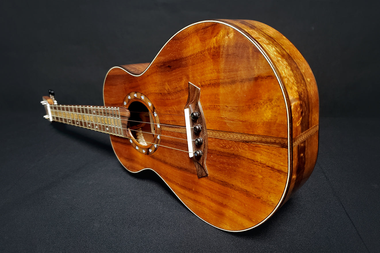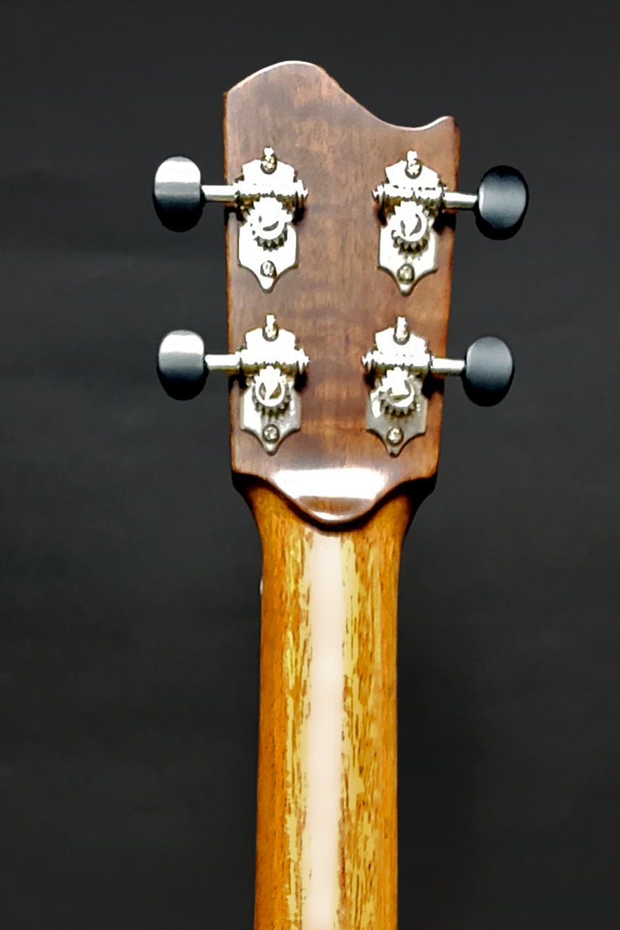 Fashioned in all solid koa, the body has mostly linear graining with a nice luster to the wood. We've chosen a rosewood binding for this instrument, contrasting the koa body nicely.