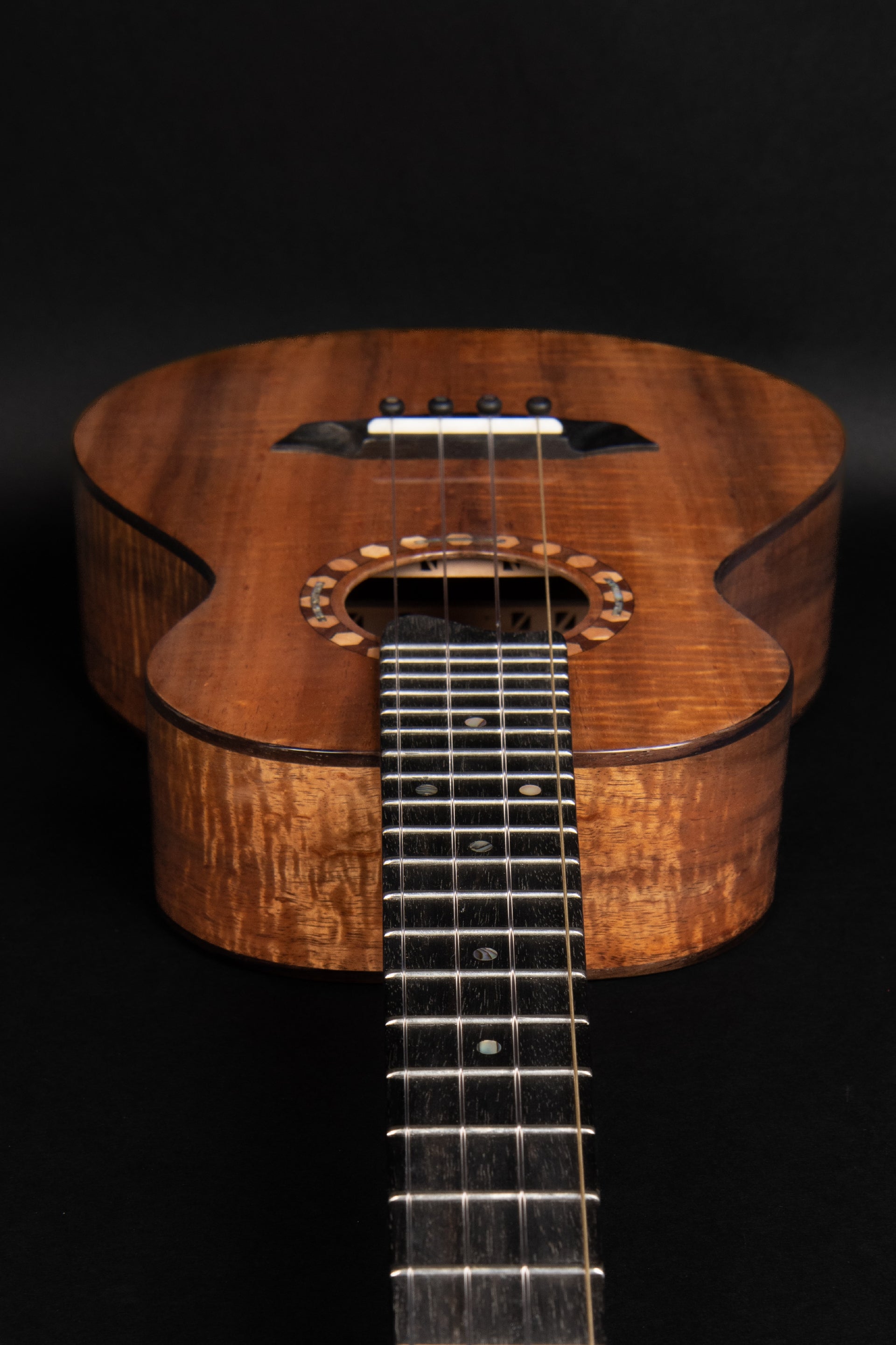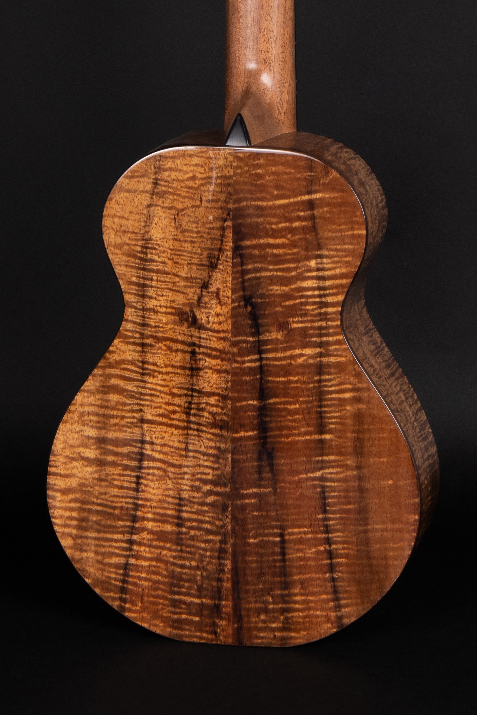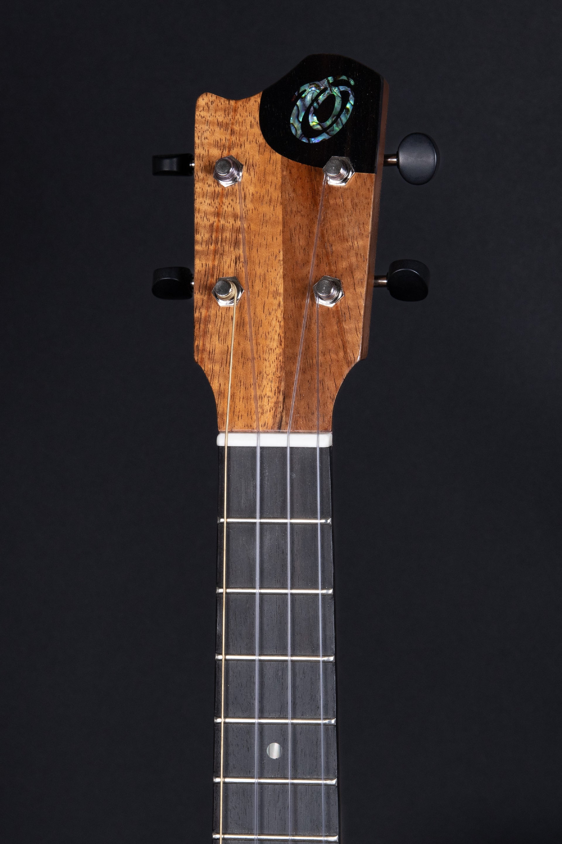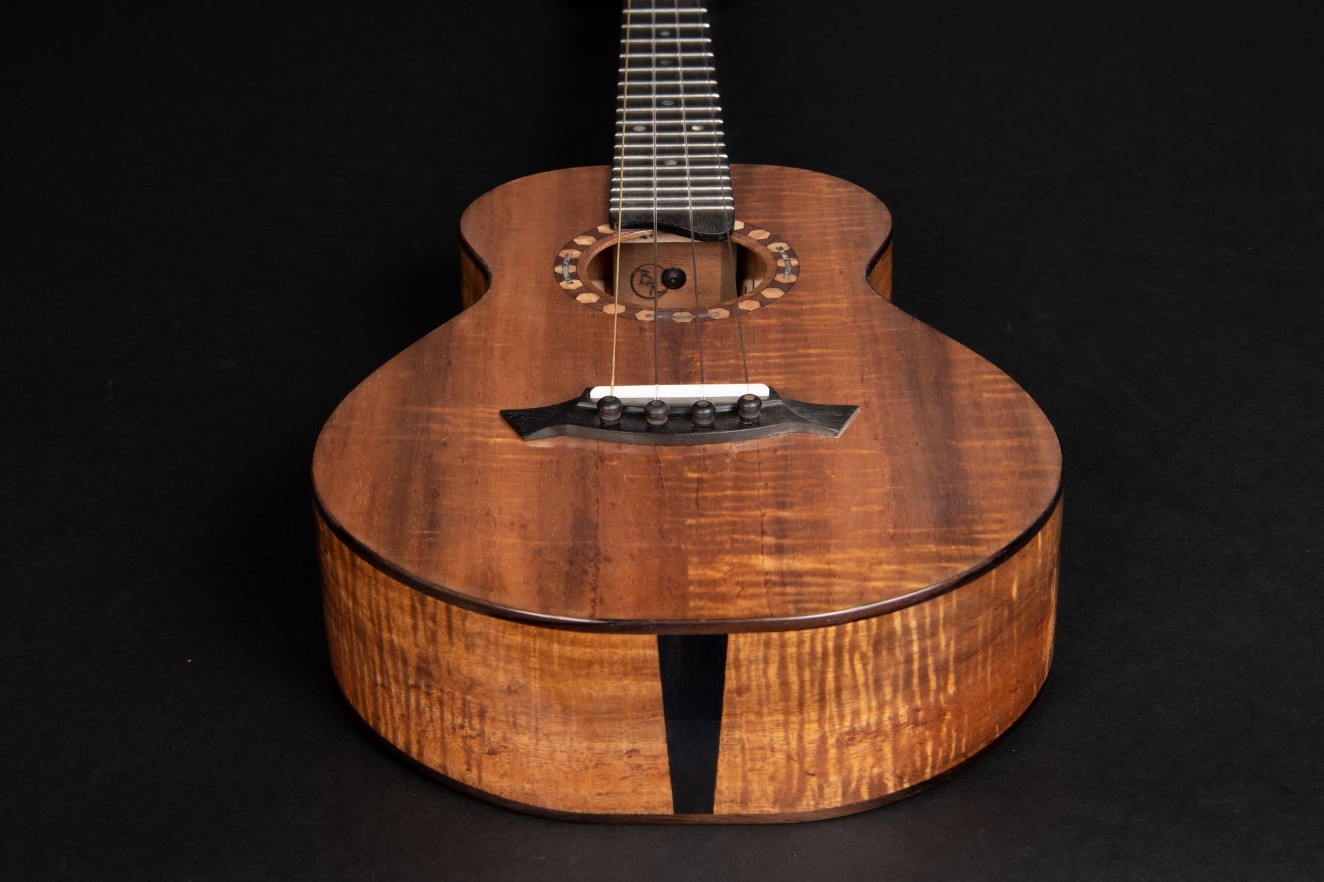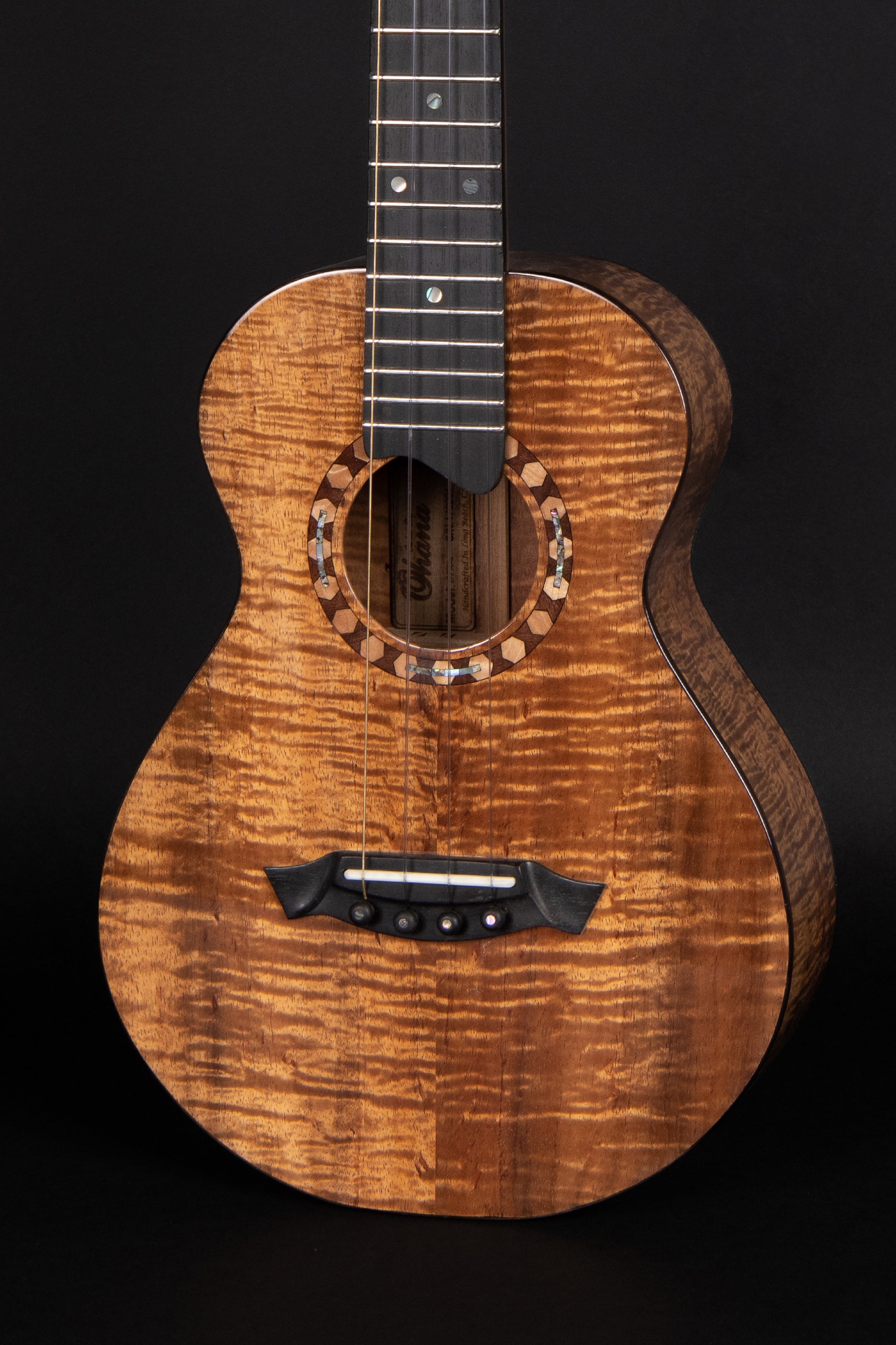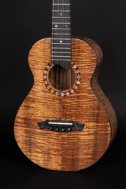 The DTK-2 custom tenor sparkles with its cascading, ripple-like tonewood, accentuated by the high gloss finish. Made using all-solid deluxe Hawaiian Koa with rosewood binding, the fingerboard markers and headstock inlay design perfectly complement the simple yet elegant rosette.